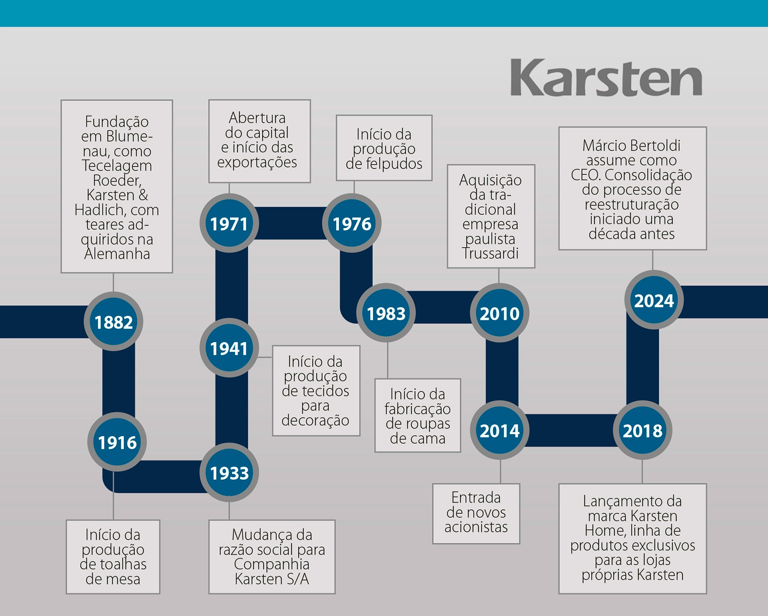 Fundada em 1882, a blumenauense Karsten completou 142 anos no dia 29 de setembro de 2024 – é uma das empresas mais antigas do Brasil em atividade. “Eu me sinto com muita responsabilidade por manter o legado, mas também por transformar esta organização para os novos dias e tempos que estão aparecendo no horizonte”, afirma Márcio Bertoldi, 53 anos, que assumiu como CEO no início de 2024. “Estamos saindo de uma economia predominantemente industrial para uma economia fundamentada no digital. É uma honra ser testemunha e liderar a mudança cultural pela qual estamos passando.”