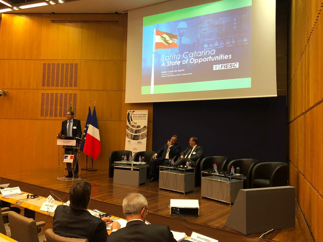Florianópolis, 5.6.2019 – No 6º Fórum Econômico Brasil-França, o presidente da Federação das Indústrias de Santa Catarina (FIESC), Mario Cezar de Aguiar, apresentou as oportunidades de investimentos em infraestrutura, energia e inovação. Ele participou de painel sobre oportunidades de parceria nos estados brasileiros ao lado dos presidentes das federações de indústria de Goiás, Sandro Mabel, e do Mato Grosso, Gustavo de Oliveira. O encontro foi realizado em Paris, nesta quarta-feira (5), na sede do Ministério de Economia e Finanças, com a participação de cerca de 120 representantes franceses e brasileiros dos setores de energia, financeiro, cidades inteligentes, indústria cimenteira e governo.