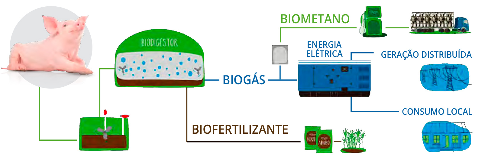 O biogás, por sua vez, pode ser convertido em eletricidade se utilizado como combustível de geradores a gás. A energia produzida é aproveitada nas propriedades rurais ou aplicada na rede elétrica como geração distribuída. O biogás também pode ser purificado, com a retirada do dióxido de carbono, e se obtém o biometano. É um produto com características similares ao gás natural e que pode até mesmo ser misturado e distribuído pelas redes convencionais. Também é usado diretamente como combustível veicular, em substituição ao gás natural ou óleo diesel. Com todas essas aplicações fecha-se o processo de economia circular na cadeia da suinocultura.