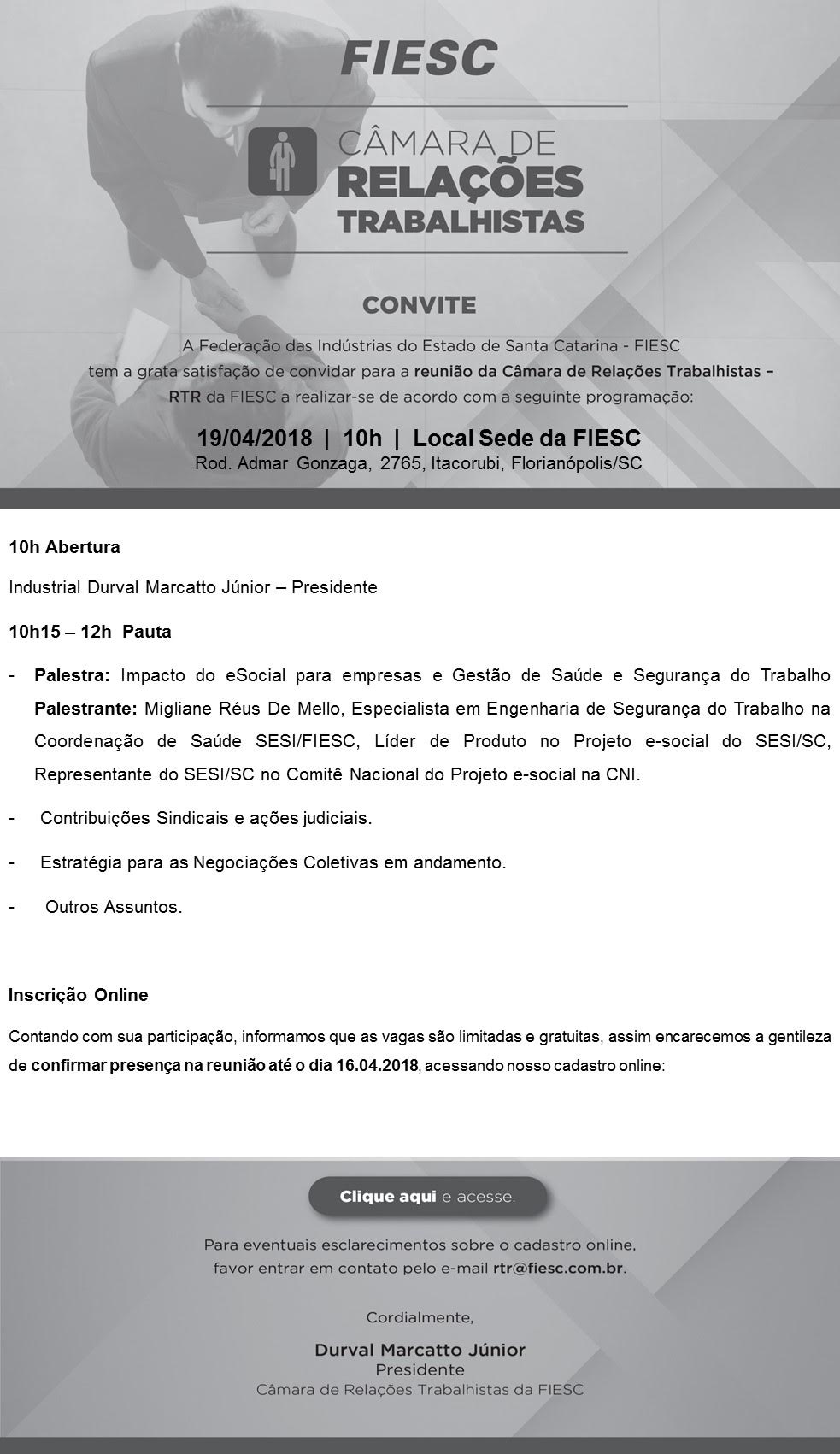 Florianópolis, 17.4.2018 – O impacto do eSocial, Sistema Público de Escrituração Digital criado pelo governo federal, e a gestão da saúde e da segurança no trabalho serão abordados nesta quinta-feira (19) durante reunião da Câmara de Relações Trabalhistas da FIESC. O encontro se inicia às 10 horas, na sede da entidade, e os interessados em participar devem se inscrever aqui.