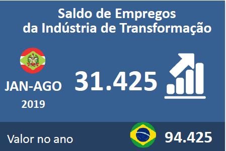 Florianópolis, 24.9.2019 – De janeiro a agosto, a indústria de transformação catarinense acumula saldo positivo de 31,4 mil empregos, o melhor desempenho desde 2013. Os destaques foram os setores têxtil e vestuário (7,7 mil vagas), seguido por alimentos e bebidas (6,9 mil vagas) e material elétrico e de comunicação (3.040 vagas). Os dados são do Ministério da Economia e foram compilados pelo Observatório FIESC. Veja aqui os dados