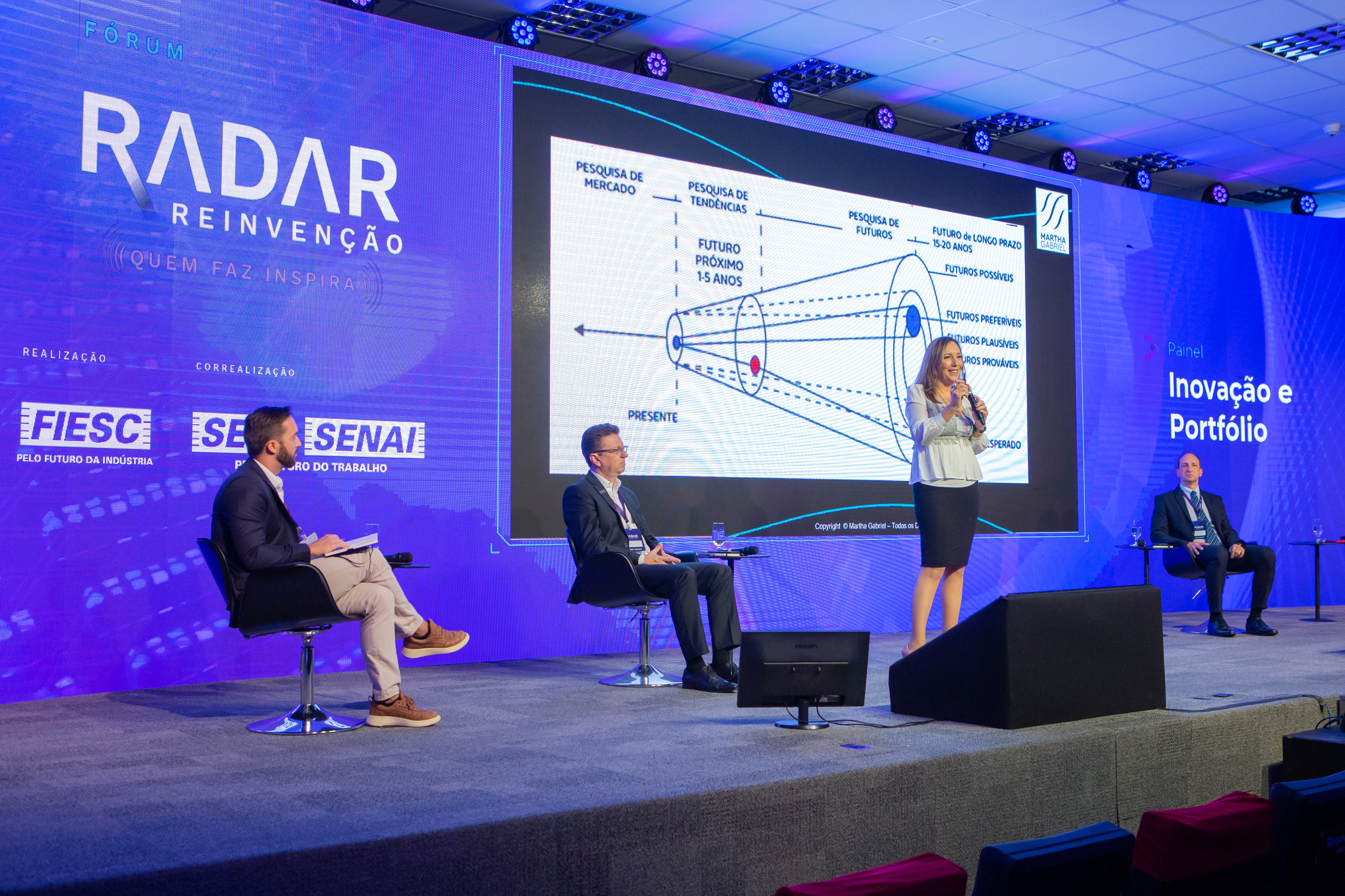 A especialista em tendências e inovação abriu o segundo dia do Fórum Radar, da FIESC, nesta quarta-feira, dia 10, ao lado de Rodrigo Fumo, diretor global de engenharia e inovação tecnológica da Weg; Amilcar Scheffer, diretor da unidade de negócios da Intelbras, e Felipe Colombo, CEO da Anjo Tintas