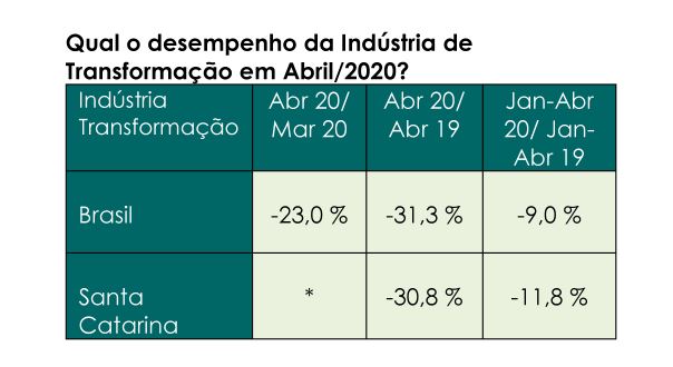 Florianópolis, 10.6.2020 – A produção da indústria de transformação de Santa Catarina recuou -11,8% de janeiro a abril na comparação com o mesmo período em 2019. Os dados são do IBGE e foram divulgados pelo Observatório FIESC, nesta quarta-feira, dia 10. Das 12 atividades pesquisadas, 11 registraram queda na produção, com destaque para metalurgia (-23,4%), veículos automotores (-26,3%), vestuário e acessórios (-23,4%), produtos têxteis (-13,8%) e máquinas e equipamentos (-16,8%). No período, o setor de produtos alimentícios foi o único que registrou alta (4,3%). Confira abaixo os dados completos.
