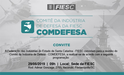 Florianópolis, 24.5.2019 – As competências e iniciativas do departamento de financiamentos e economia de defesa, do Ministério de Defesa, serão tema de reunião do Comitê da Indústria de Defesa da FIESC, que será realizada no dia 29 de maio, às 9 horas, na FIESC, em Florianópolis. Os interessados em participar devem confirmar presença aqui.