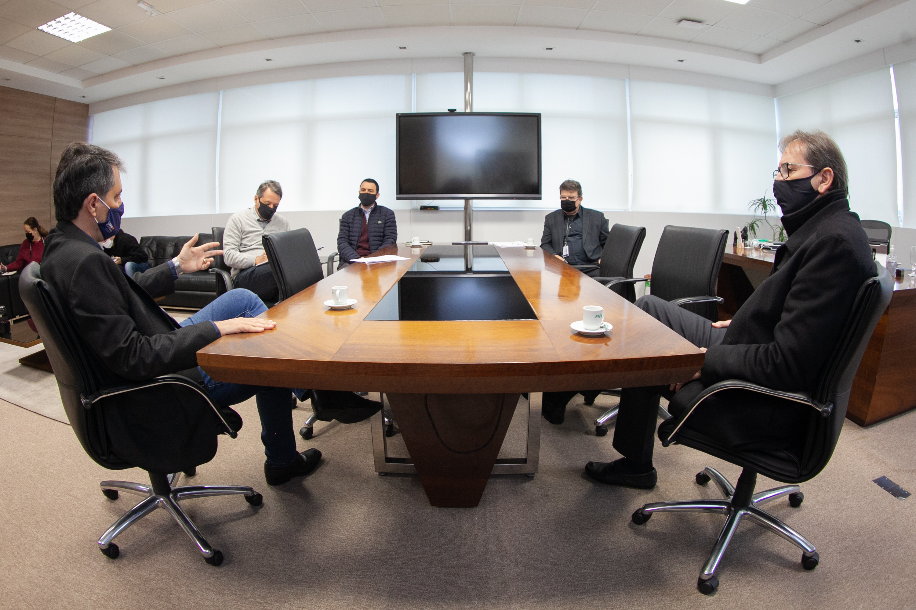 Florianópolis, 20.8.2019 – O secretário de Estado da Saúde, André Motta Ribeiro, conheceu, nesta quinta-feira (20) as competências e estrutura da Federação das Indústrias Federação das Indústrias de Santa Catarina (FIESC)) que podem ser utilizadas para o enfrentamento da Covid-19. Recebido pelo presidente Mario Cezar de Aguiar e pelos diretores Fabrizio Machado Pereira, José Eduardo Fiates e Carlos Kurtz, Motta conheceu detalhes do coronadados, um sistema de monitoramento massivo de sintomáticos desenvolvido pelo SESI e SENAI de Santa Catarina, entidades da FIESC, e o Observatório FIESC, que congrega dados econômicos e sociais, inclusive de saúde, de Santa Catarina. O presidente da Associação Catarinense de Medicina, Ademar José de Oliveira Paes Jr. participou do encontro.