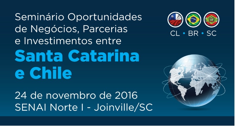 Florianópolis, 18.11.2016 – A Federação das Indústrias de Santa Catarina (FIESC) realiza seminário de oportunidades de negócios, parcerias e investimentos entre Santa Catarina e o Chile, no dia 24 de novembro, das 15h às 17h, em Joinville, no SENAI Norte I (Rua Arno Waldemar Döhler, 957, zona industrial norte). O encontro terá participação do embaixador do Chile no Brasil, Jaime Gazmuri Mujica, do diretor comercial do ProChile em São Paulo, Álvaro Camargo, e do executivo da Invest Chile, Salvatore Di Giovanni.