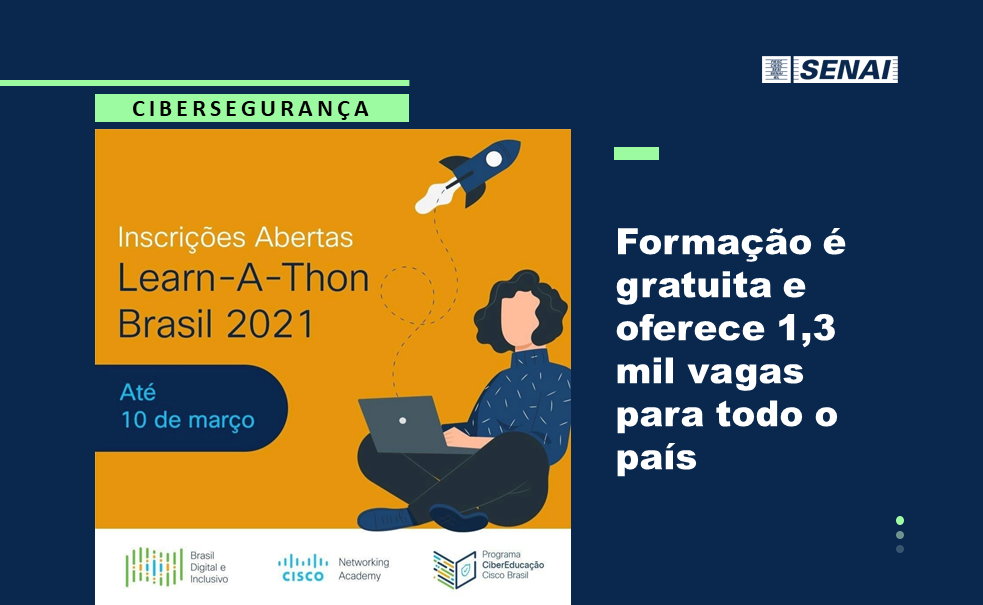 Florianópolis, 5.3.2021 - A área de segurança digital tem oferecido diversas oportunidades de carreira e o SENAI, em parceria com a Cisco, realiza um programa gratuito para formação de profissionais que queiram ingressar nesta área. As inscrições para a maratona classificatória seguem até quarta-feira, dia 10, pelo site da Cisco ou pelas academias NetAcad do SENAI. O curso ocorre de forma 100% remota em quatro fases, sendo que a segunda etapa de formação é oferecida pelo SENAI de Santa Catarina.