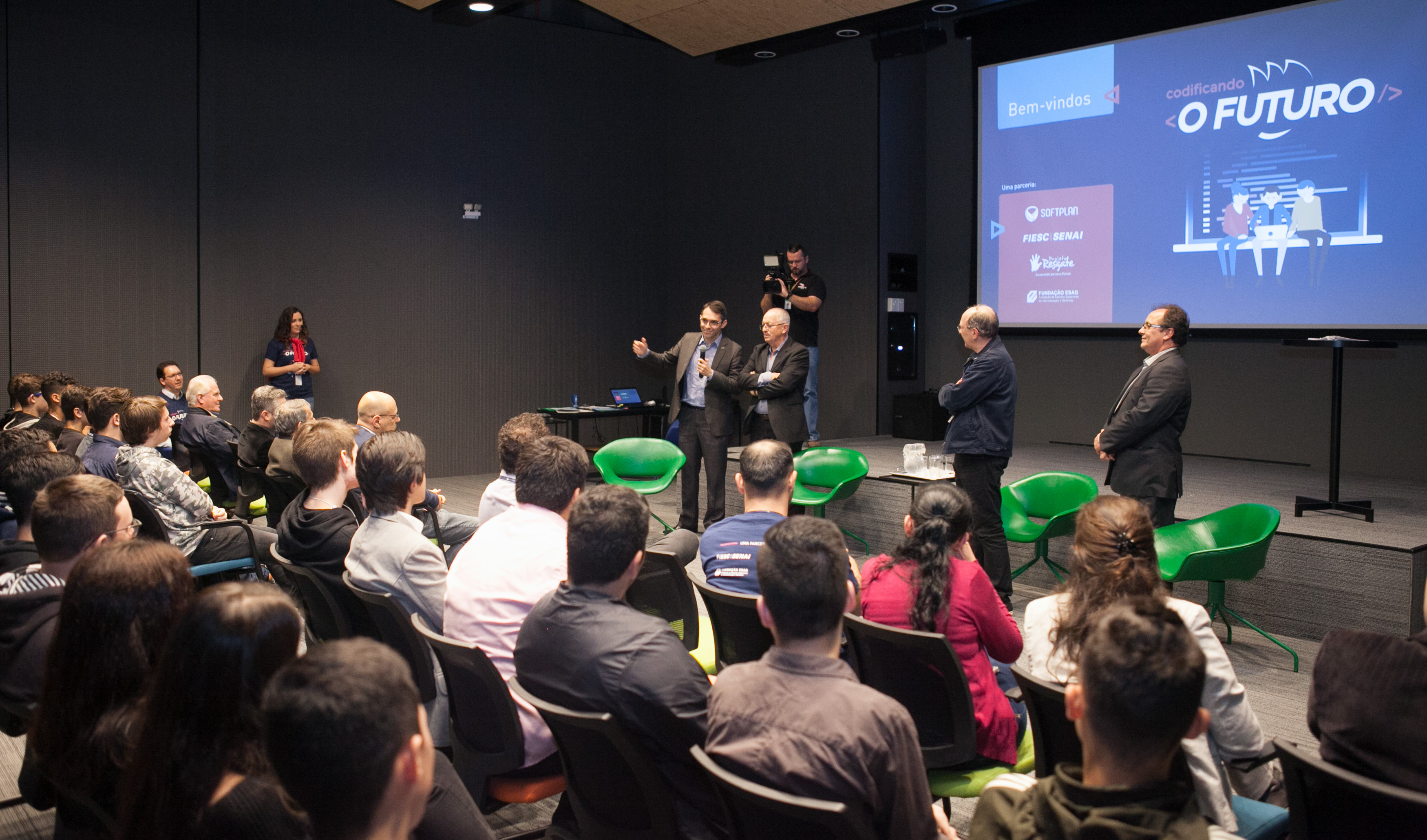 Florianópolis, 03.9.2018 – Jovens de baixa renda, estudantes de uma dezena de escolas públicas de Florianópolis iniciaram nesta segunda (3) a participação no projeto Codificando o Futuro, uma parceria do SENAI/SC, entidade da FIESC, Softplan, Fundação Esag e Projeto Resgate. A proposta é oferecer aos estudantes de ensino médio a oportunidade de buscar uma capacitação que tende a se tornar cada vez mais fundamental em todas as profissões. Os 40 adolescentes que integram a primeira turma tiveram aula inaugural nesta segunda, na sede da Softplan.