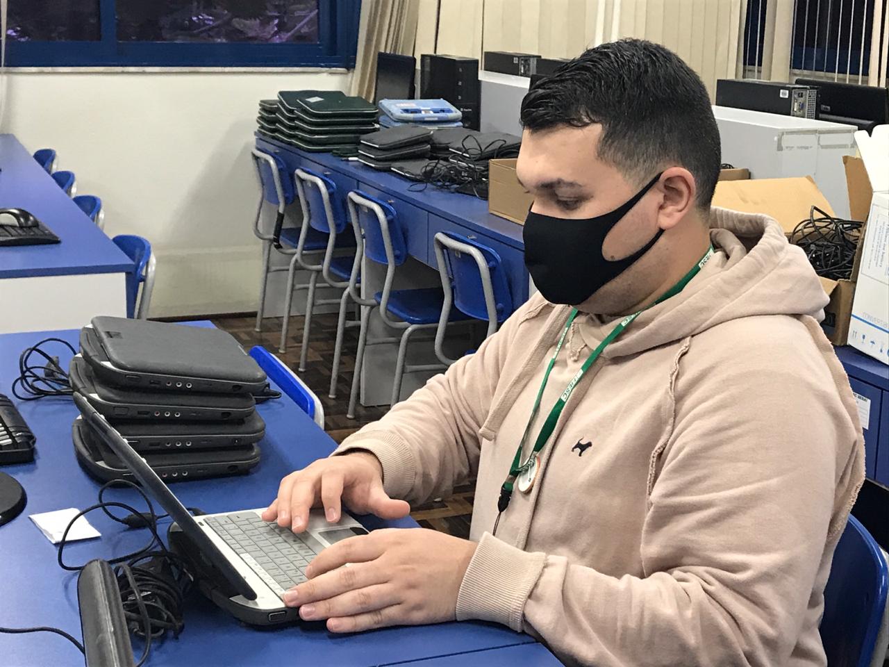Os primeiros a receber os computadores foram os alunos da Escola Intendente Aricomedes da Silva, no bairro Cachoeira do Bom Jesus, em Florianópolis. No início do isolamento, a escola fez uma pesquisa com os alunos dos nonos anos, e identificou que 10% dos estudantes não têm celular ou computador em casa. Eles tiveram prioridade na entrega. Atualmente, 75 jovens ainda estão à espera do equipamento.