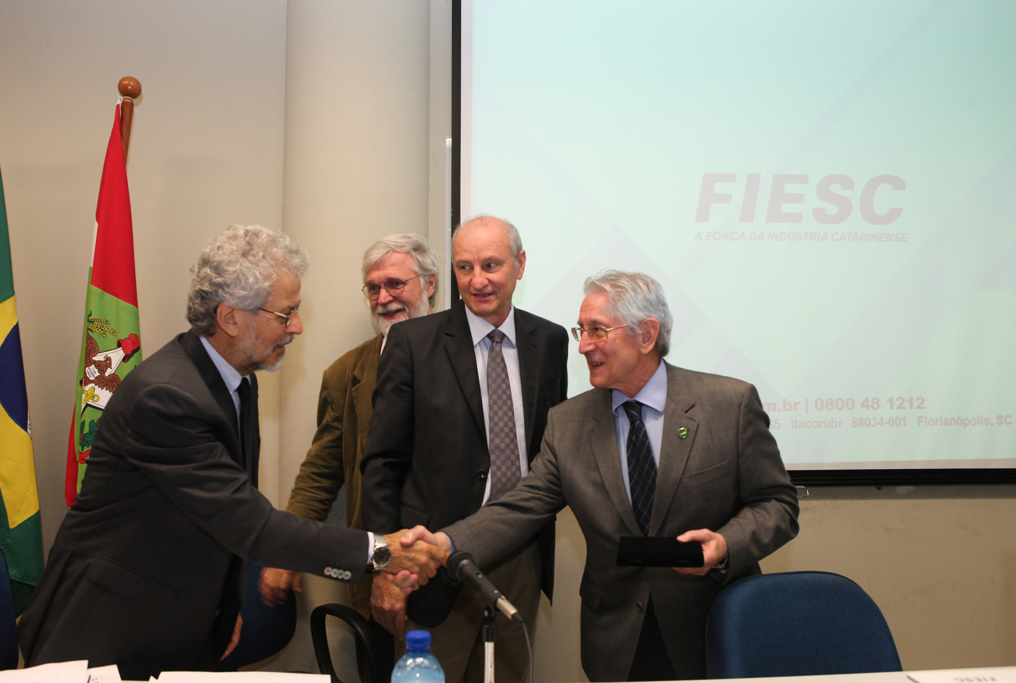 Florianópolis, 5.8.2015 – O Departamento de Engenharia Mecânica da Universidade Federal de Santa Catarina (UFSC) prestou homenagem ao presidente da Federação das Indústrias de Santa Catarina (FIESC), Glauco José Côrte, por sua atuação em favor da indústria catarinense e da educação. O evento, que ocorreu nesta quarta-feira (5), em Florianópolis, debateu ainda o planejamento estratégico do Departamento para a próxima década. Além do presidente da FIESC, o industrial Roberto Campos, que é presidente da Embraco, também foi reconhecido por sua trajetória como engenheiro mecânico.