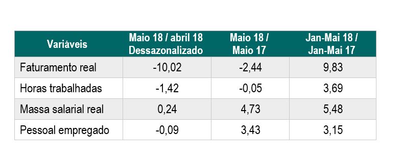 De janeiro a maio em relação ao acumulado de 2017, o faturamento cresceu em 12 das quatorze atividades pesquisadas. As maiores ampliações estão em vestuário e acessórios (35,2%), produtos de metal (22,8%) e produtos alimentícios (22,3%). Entre os segmentos que registraram queda estão celulose e papel (-5,2%), borracha e material plástico (-0,6%) e produtos têxteis (0,5%). No mesmo período, o desempenho da massa salarial aumentou 5,5%, com crescimento em 13 segmentos consultados. Os destaques ficaram com informática e eletrônicos (20,8%), móveis (13,8%) e produtos de metal (12,7%). Clique aqui e veja os indicadores completos.