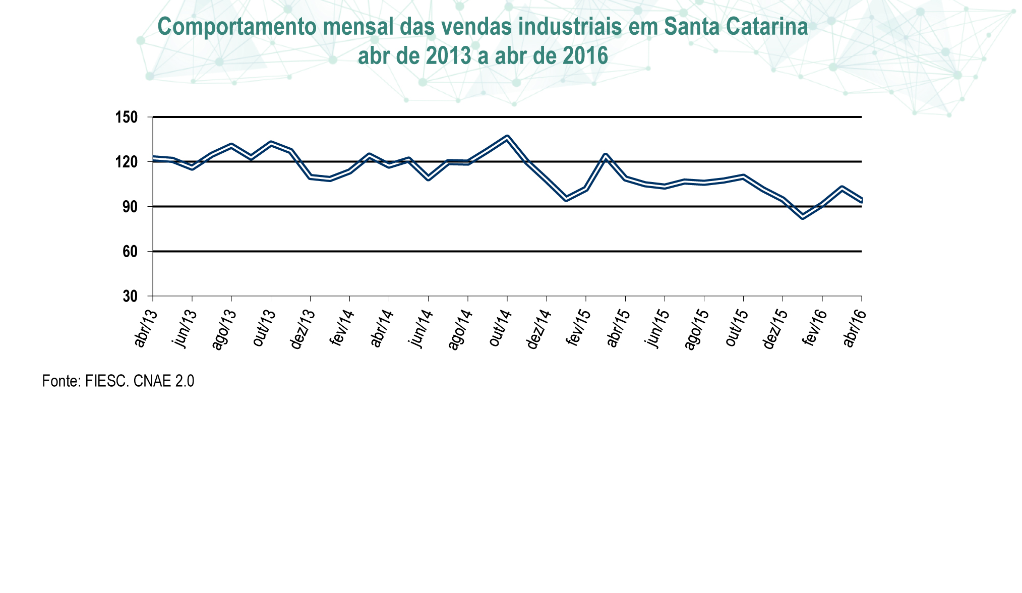 Florianópolis, 02.06.2016 – As vendas da indústria catarinense acumulam queda de 13,7% entre janeiro e abril, na comparação com o mesmo período do ano passado. Os setores de produtos de metal (-35%), móveis (-28,5%) e confecção de vestuário (-20,5%) foram os que apresentaram as maiores baixas. O único segmento a registrar alta no período foi o de bebidas, com 7,1%. Os números integram a pesquisa Indicadores Industriais de SC, divulgada nesta quinta-feira (02) pela Federação das Indústrias de Santa Catarina (FIESC).