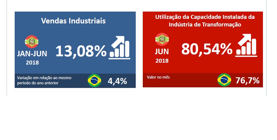Florianópolis, 2.8.2018 – As vendas da indústria catarinense fecharam o primeiro semestre do ano com alta de 13% em relação ao mesmo período em 2017, com dados dessazonalizados, informa a pesquisa indicadores industriais, da Federação das Indústrias de Santa Catarina (FIESC). Das 14 atividades consultadas, 13 registraram crescimento, com destaque para produtos de metal (alta de 32,5%), produtos alimentícios (aumento de 31,1%) e vestuário e acessórios (expansão de 27,9%). Celulose e papel foi o único setor com desempenho negativo (-2,7%) no período. Em junho, o faturamento cresceu 35,8% em comparação com o mês anterior, mostram os dados dessazonalizados. Clique aqui e saiba mais.