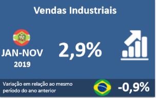 Florianópolis, 17.1.2020 – As vendas da indústria catarinense acumulam alta de 2,9% até novembro, mostra pesquisa da FIESC, divulgada nesta sexta-feira (17). No período foi observado avanço em 11 das 14 atividades pesquisadas, com destaque para informática e eletrônicos (14,5%), produtos de metal (11,6%) e metalurgia (5,3%). Os segmentos que registraram desempenho negativo foram vestuário e acessórios (-1,6%), produtos de madeira (-0,9%) e produtos têxteis (-0,6%). Veja aqui os dados completos