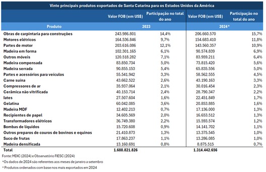Em 2024, os Estados Unidos ganharam espaço em relação à China e assumiram a liderança isolada como destino das exportações catarinenses. De janeiro a setembro deste ano, os 20 principais produtos de Santa Catarina exportados para os EUA somaram US$ 1,314 bilhão. O ranking é liderado por obras de carpintaria para construções, com US$ 207 mihões em vendas, seguida por motores elétricos, com US$ 155 milhões, e partes de motor (US$ 144 milhões). Confira a lista completa abaixo.