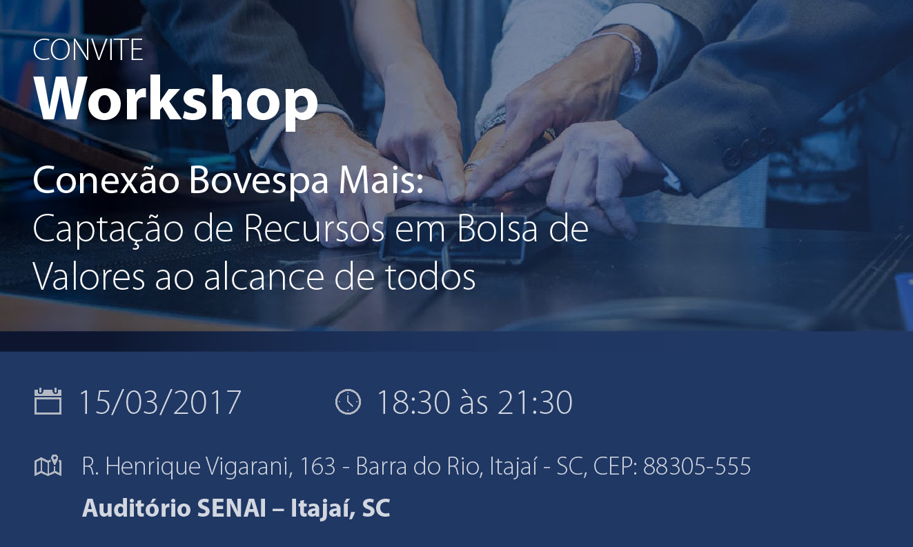 Florianópolis, 9.3.2017 – Itajaí recebe na próxima quarta-feira, dia 15, o workshop “Captação de recursos em bolsa de valores ao alcance de todos, promovido pela BM&F Bovespa e Magnólia Partners, com o apoio da FIESC. O encontro será no SENAI, das 18h30 às 21h30, e contará com as palestras: SC em números, com a Investe SC; como preparar sua empresa para receber investimento societário, com a Cabanellos Schuh Advogados Associados, e valuation e captação de recursos via private equity, com a Magnólia Partners, empresa que estrutura processos de fusões e aquisições no Brasil.